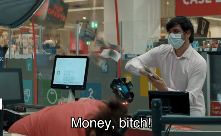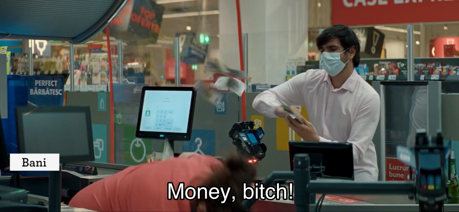 Queste immagini di vita quotidiana, così spoglie di qualsiasi estetismo o artificio narrativo, mi hanno richiamato alla mente una frase di Schopenhauer: “Il grande sogno della vita è uno soltanto. La volontà di vivere”. Una volontà, questa, che non ha nessuno scopo, che non tende a una meta e che non è determinata da alcuna razionalità. Ma l’essere umano ha bisogno di una finalità che mascheri le due pulsioni fondamentali dell’inconscio (quella sessuale, per riprodursi, e quella aggressiva, per difendere la prole), e da questa necessità nascono le rappresentazioni di significato in cui viviamo e in cui ci riconosciamo come parte di una società. O di un branco, se preferite. Nella prima parte del film ho potuto gustare la vita quotidiana di Bucarest e ammirare l’individualismo imperante di automobilisti sui marciapiedi e di signore spietate in fila alla cassa. Una messa a nudo della violenza e del disordine, elegante nella sua imparzialità. Non meno significativo è stato vedere le inconfondibili insegne del capitalismo che tutti noi conosciamo (gli ipermercati smisurati, i grandi magazzini, i palazzoni delle multinazionali), affiancate dagli enormi e onnipresenti condomini di epoca sovietica, grigi e fatiscenti, che fanno da sipario a tutte le scene.