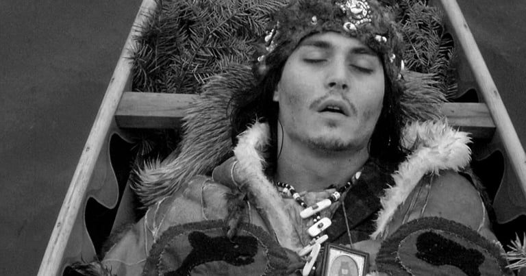 È qui che inizia il viaggio spirituale di William Blake verso la morte: il nativo americano dal nome “Nessuno” – interpretato da Gary Farmer – lo trova riverso in fin di vita in una pozza mista a sangue e fango. La fuga dalla città e la ricerca di un rifugio nella foresta portano il protagonista a non comprendere più cosa sia vero e cosa sia frutto della sua immaginazione. Jarmusch è un perfezionista nel cercare di ricreare sinestesie; lo spettatore si sente come cullato dai ritmi cadenzati e distorti di ogni tappa del lungo cammino, la lentezza e la quiete dei boschi fanno da contraltare al dolore e all’irrequietezza che caratterizzano i pochi attimi di lucidità del già-morto William Blake, il quale sembra trovare rifugio alle proprie pene solo fra le braccia di Morfeo. Nessuno, convinto che il suo compagno di viaggio sia la reincarnazione del poeta inglese omonimo, si prende in carico di far trapassare la sua anima nel mondo degli spiriti, proteggendo il giovane dagli uomini che lo inseguono, a causa della taglia che incombe sulla sua testa, posta da Dickinson per rivendicare la morte del figlio. Il voyage diviene il pendolo tra sogno e realtà, tra la vita e la morte, tra ciò che vi è, che esiste, e ciò che ormai non c’è più e di cui rimane solo un’ombra. La vecchia identità di William Blake è ormai sfumata, al suo posto, uno spirito nuovo abita le membra del timido contabile di Cleveland: una forza redentrice muove gli ultimi passi di costui, prossimo al trapasso e pronto a ricongiungersi con il grande spirito della terra, per concedersi, finalmente, un po’ di ristoro, cullato dalle acque del fiume.
