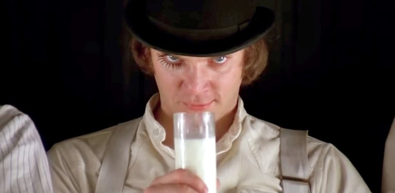 L’inquadratura iniziale di Kubrick, in cui Alex ti fissa direttamente, è impegnativa, ipnotica, complice e autoritaria. Introdotto in questo mondo violento sei bloccato con uno psicopatico come unico e principale eroe. Intrappolato e affascinato, attratto e respinto, guardi, ascolti e godi e questo perché per un ragazzo del genere non puoi che provare una sorta di attrazione, fattene una ragione. La sua sociopatica joie de vivre e il suo stile non a caso diventano presto mito, grazie ai costumi (bombetta, tuta bianca, anfibi, bastone, maschere, nasi fallici e pinocchieschi), alle scenografie (il Korova Milk Bar e le sue bianche statue di donne nude), al montaggio pop-art e musicale, all’uso stravolto ‒ geniale contrappunto ‒ di brani di musica classica (Purcell, Rossini, Beethoven) e di musica leggera (Singin’ in the Rain), alle riprese che vedono susseguirsi lentissimi carrelli, rapidissimi zoom, ralenti, accelerazioni, obiettivi deformanti, cinepresa tenuta a mano, tutto sotto l’algido bagliore di una fonte di luce quasi sempre in campo.