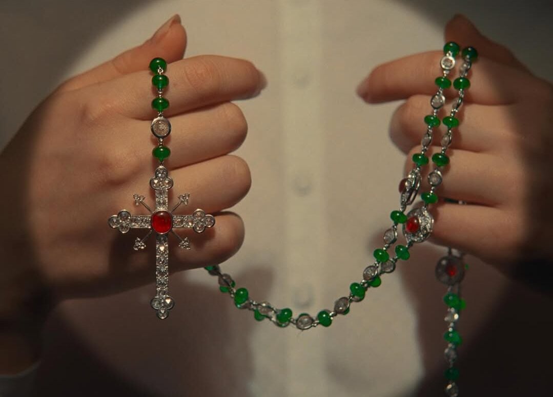This negotiation vividly manifests through potent visual symbols: materially, as the daughter's red plastic rosary gives way to a shimmering green Cartier’ s one; spiritually, through the father's imagined trials within a bureaucratic court. Far beyond simple object swaps or static visual frames, these elements collectively forge the assignment of a new place in society and a relentless negotiation of identity, where symbols of faith and morality merge with opulence and expectations.